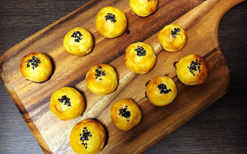 6. Xếp bánh vào nồi chiên không dầu và quét 1 lớp lòng đỏ trứng lên trên mặt bánh và rắc một ít mè đen lên bánh để bánh thơm và đẹp mắt hơn