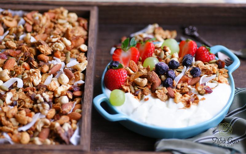 Granola nướng thơm giòn, ăn kèm với sữa chua/sữa tươi thêm chút trái cây tươi là bạn đã làm xong một bữa sáng healthy và nhanh gọn rồi.
